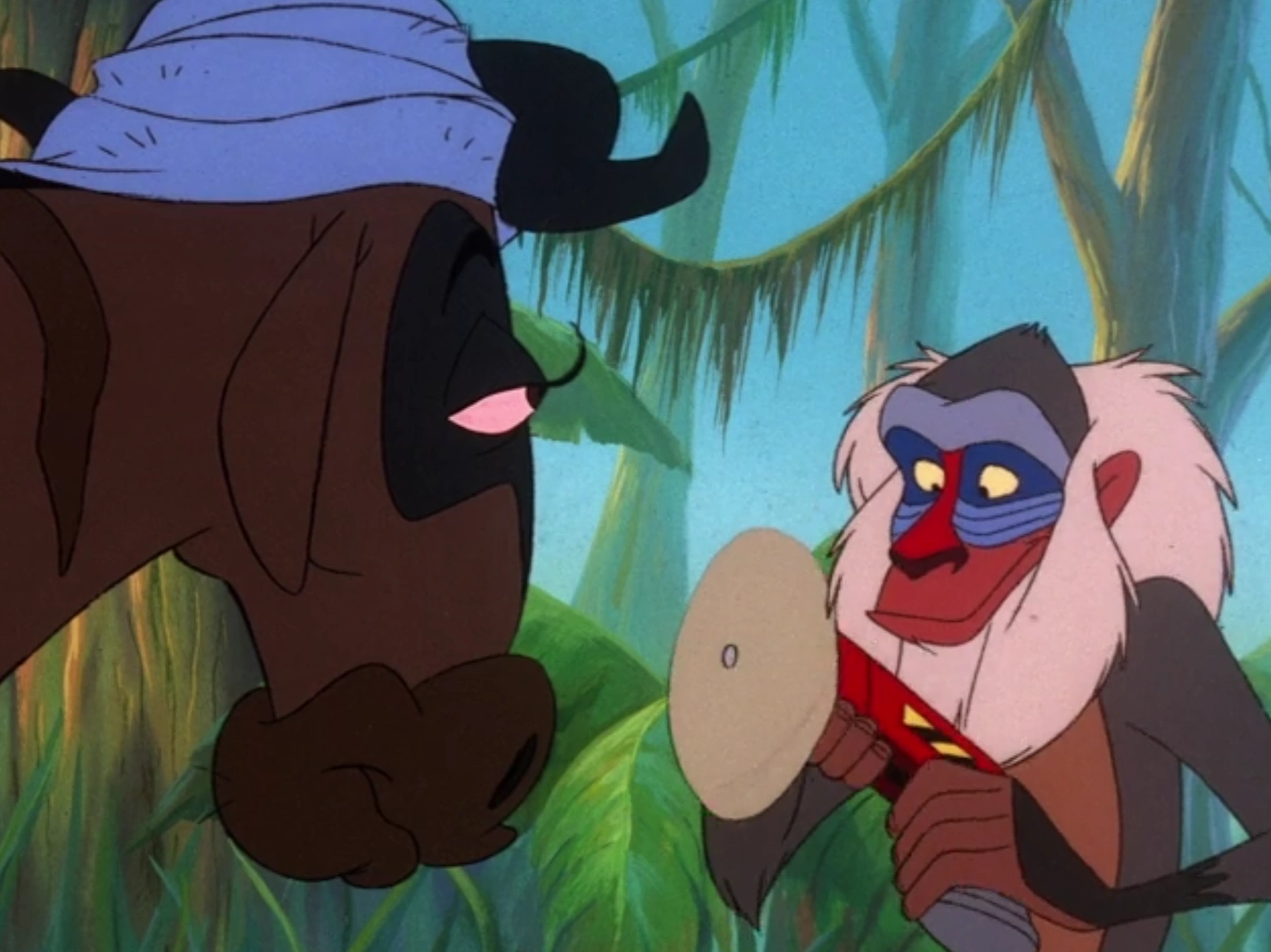 On his second attempt to tame Herman, Rafiki offers the wildebeest a special drink that will make his voice sound less grotesque. Though initially hesitant to try the drink, Herman takes a sip and finds that the potion works but makes his voice change every few seconds. A simple hit on the head with Rafiki's stick makes the sounds stop changing, and Herman is left with a stunning new voice.