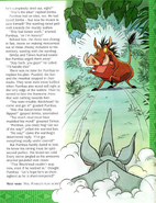 Just before the rhinoceros can move in for an attack, Pumbaa bites its tail, drawing it off, and Simba and Timon scheme to help save their friend. However, when they attempt to assist Pumbaa, he yells at them to stay away and remains firmly planted in the path of the charging rhinoceros.