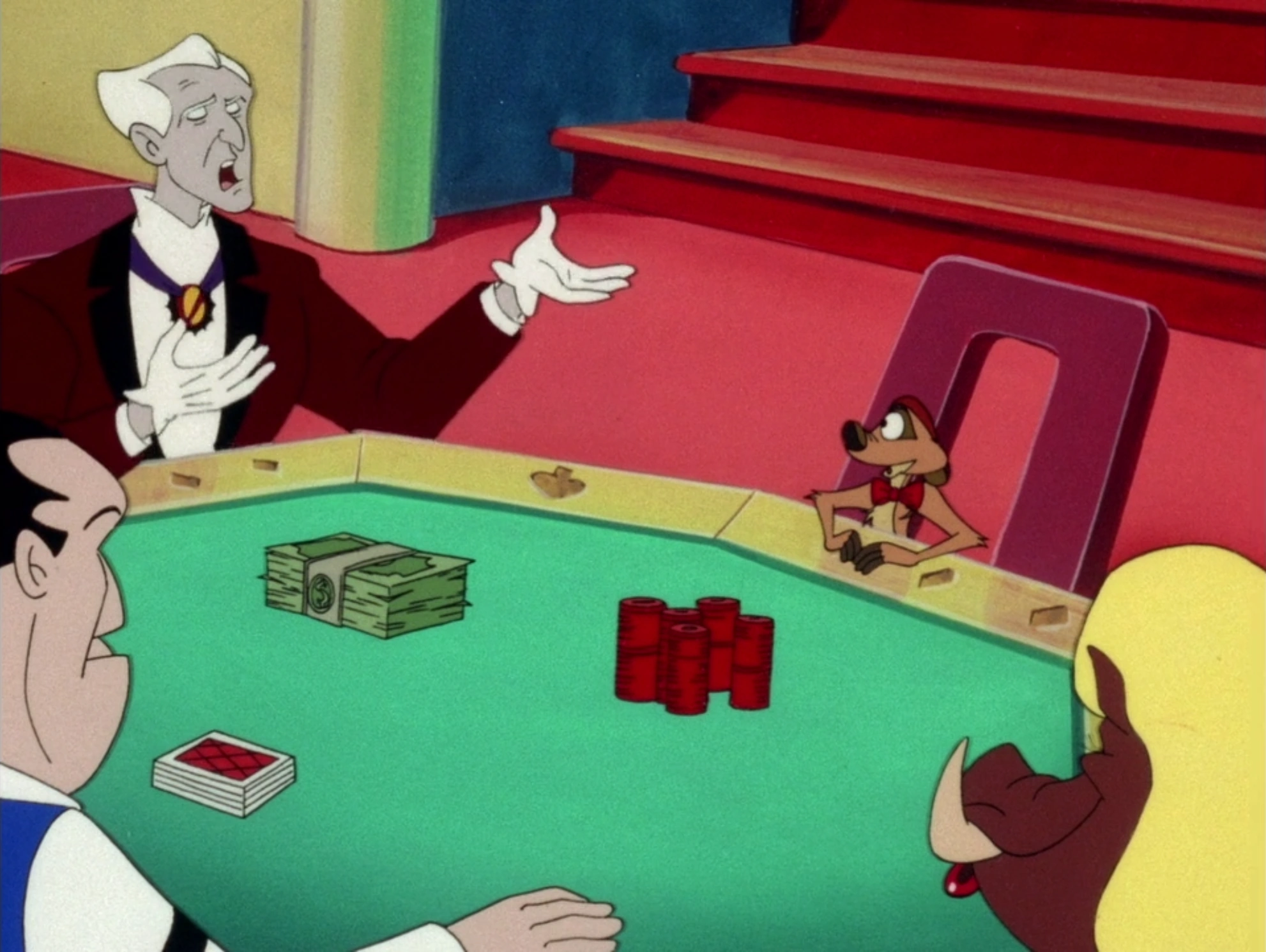 When Timon and Pumbaa arrived at Monte Carlo, they entered the casino, only to get thrown out by the owner. Afterward, a secret agent appeared and fought off some ninjas. After the spy defeated the ninjas, Pumbaa told him that he had forgotten his briefcase. This caused the spy to turn his head, run into a wall, fall down the stairs, and get knocked unconscious. With the spy out of commission, Timon and Pumbaa decided to become secret agents and finish the spy's routines, which were to beat someone at Go Fish and stop the bad guy from fulfilling his diabolical plan.