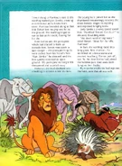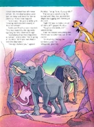 Meanwhile, Pumbaa and Simba are growing impatient, and together, they crawl into the cave, where they see the elephants exhibiting their strange rock-eating behavior. While watching, Simba notices a lone calf wandering beneath a loose column of rock, and he throws himself forward, dragging the elephant calf to safety.