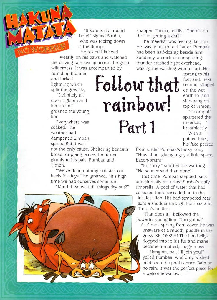 Follow that Rainbow begins by introducing Simba, the self-exiled prince of the Pride Lands, and his two friends, Timon and Pumbaa. At the start of the story, the three friends are sulking during a storm when Simba suggests that they find something fun to do. No sooner has he spoken when a crack of thunder jolts Pumbaa awake, and he falls on top of Timon and splashes Simba with water. Irritated, the young lion shoves out into the storm, followed closely by a mud-happy Pumbaa.