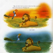 But Zazu is determined to help Mufasa, and watches over him day and night, following him everywhere. Mufasa begins to feel uncomfortable and commands Zazu to leave him in peace. But the little bird is determined and reminds Mufasa that he had saved his life, and now Zazu wanted to help him. But Mufasa protests that Zazu is ruining his hunt, and the little hornbill offers to fly up and tell Mufasa where all the game is. But the beating of his wings frightens the antelopes away and ruins Mufasa's chance at a hunt. Worse, Zazu even hovers over Mufasa while he's spending private time with his future mate, Sarabi. While the two young lions are trying to spend time together, Zazu brags about how much he knows about the Pride Lands. He even points out to Mufasa that his brother, Scar, is tormenting a mouse at the moment. But, Mufasa is irritated with the young hornbill and interrogates him if he could just be quiet for a minute, to which Zazu dives into another story about how he was once silent for nearly three days.