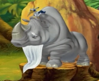 Gaucíngoua is an elderly rhinoceros. He is large and well-built, with a hunched back and thick legs. He has a wrinkled, pale gray hide, a horn with a deep gouge in the center, bushy white eyebrows, and a long white beard that grazes the ground.[1]