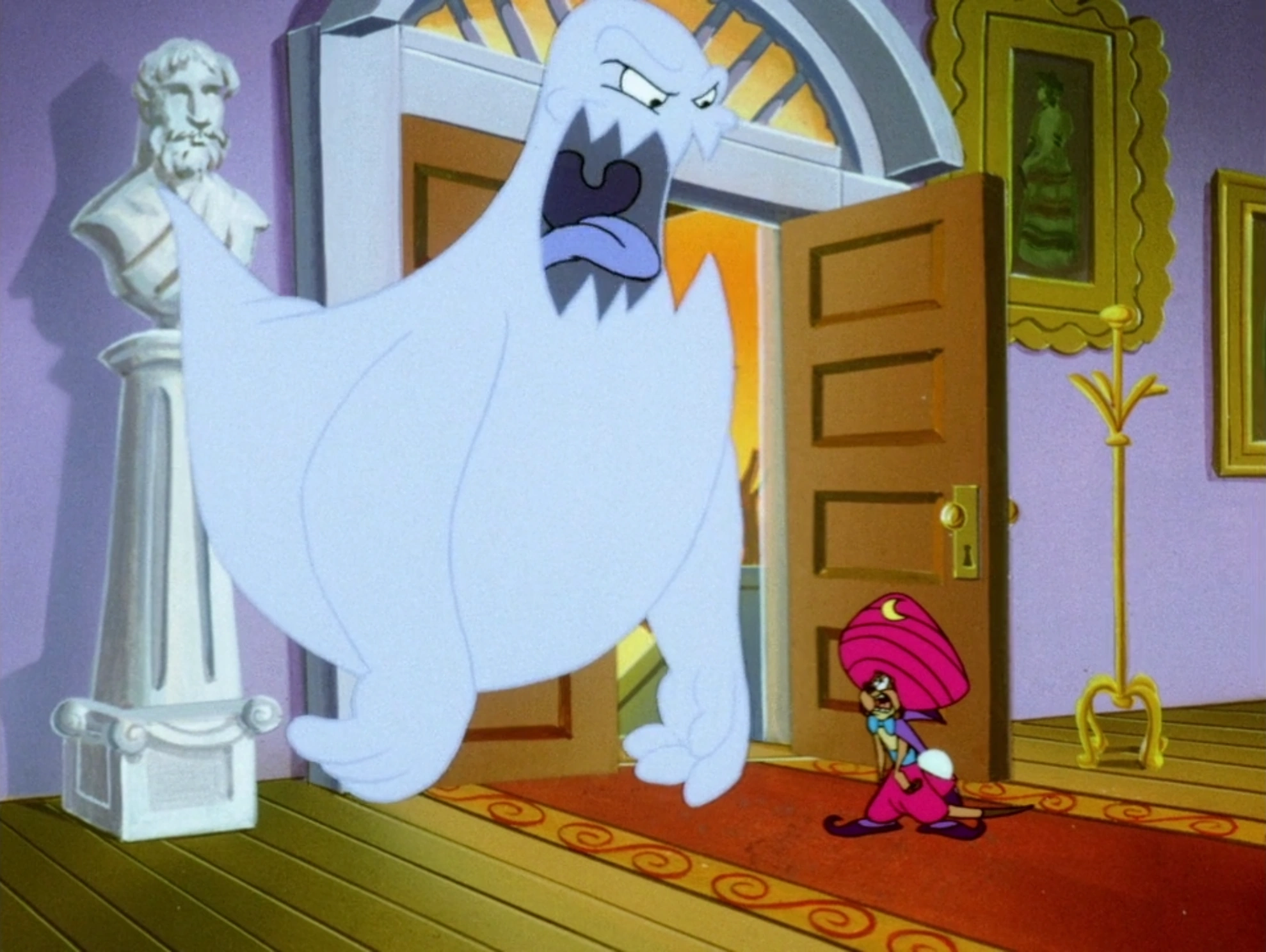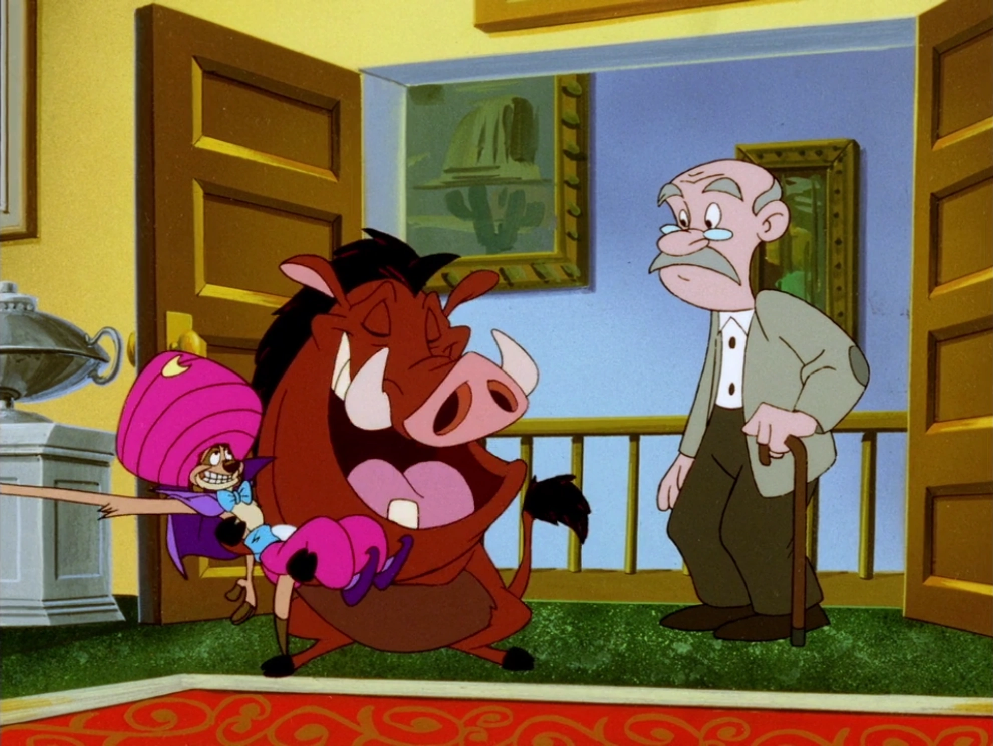Timon and Pumbaa arrived at the mansion and convinced the owner that his bedroom was haunted and that they were there to get rid of the spirit. While Timon walked downstairs with the owner, Pumbaa saw that the bedroom was really haunted. Meanwhile, Timon made the owner leave his house and told him not to return until their work was done.