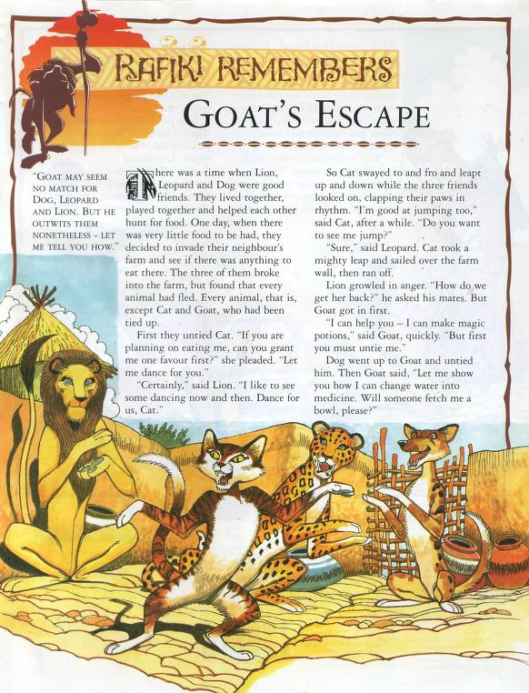 Goat's Escape is a story from the Rafiki Remembers magazine collection. It was published in the 1990s as part of The Lion King: A Nature Fun and Learn Series.
