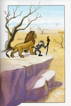 After a full day of traveling, the pair at last reached Grass Walls, only to realize that it had become a barren wasteland. Rafiki worried that something was wrong, and the friends set out to find the baboon troop. As they walked, Rafiki wondered what had become of his family, and Simba commented that he did not see any signs of life. Rafiki suggested that they visit the Great Pond, where the troop often gathered.