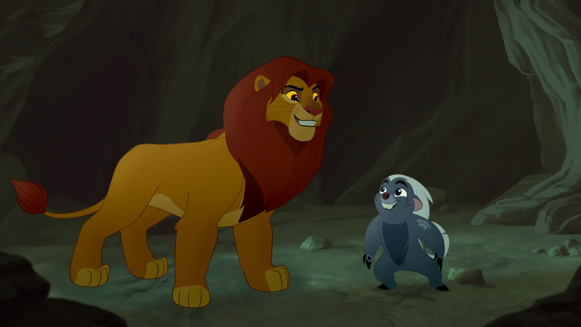 Together, Bunga and Simba traveled through the caverns until they ran into the Lion Guard, Timon, and Pumbaa, who were on the other side of a large divide. Getting an idea, Simba had Bunga cling to his back while he jumped across the canyon. They then had a delighted reunion with Timon and Pumbaa.