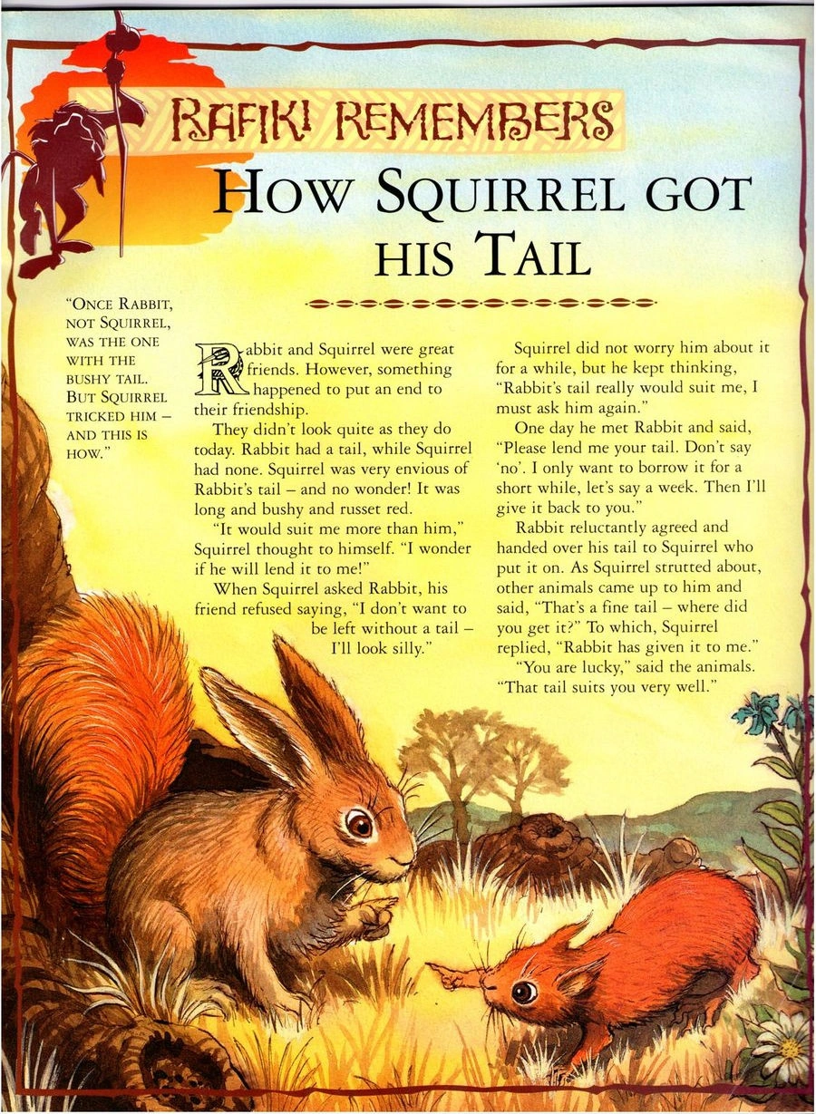 How Squirrel got his Tail is a story from the Rafiki Remembers magazine collection. It was published in the 1990s as part of The Lion King: A Nature Fun and Learn Series.