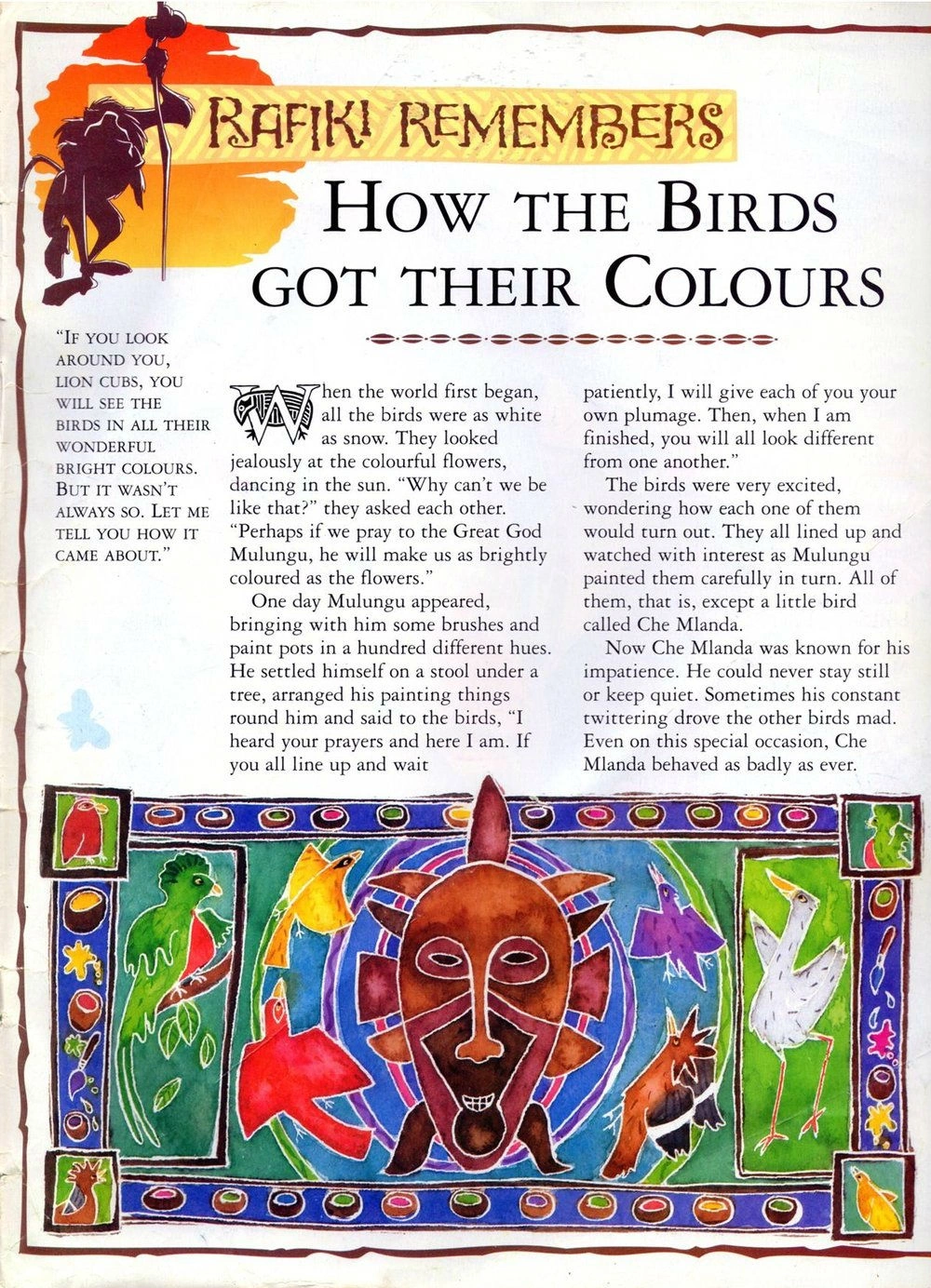 How the Birds got their Colors is a story from the Rafiki Remembers magazine collection. It was published in the 1990s as part of The Lion King: A Nature Fun and Learn Series.