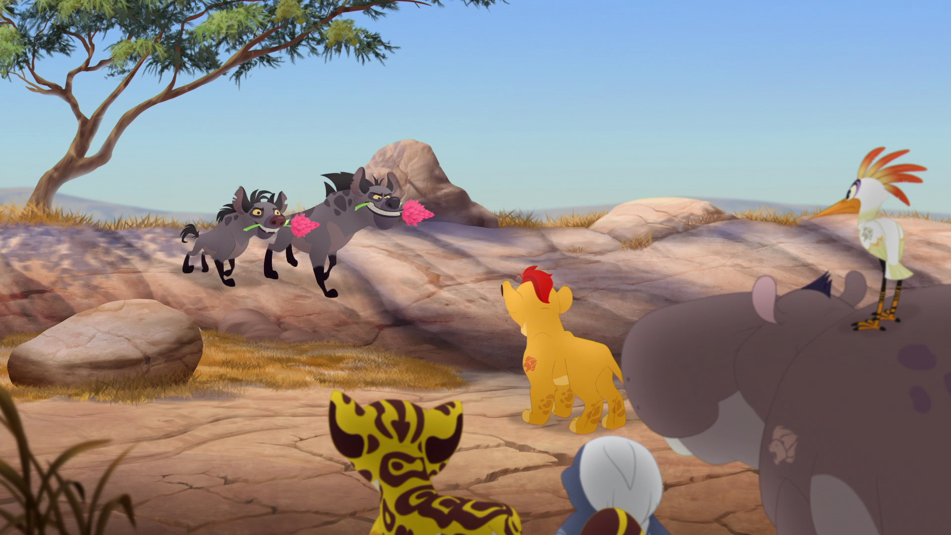 Cheezi and Chungu attack the Lion Guard with red flowers.