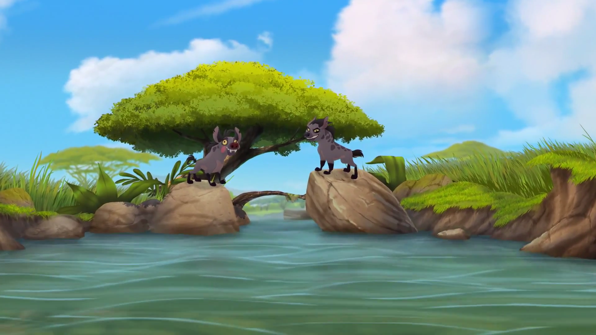 One day, Janja, Cheezi, and Chungu attacked a herd of oryxes in the Pride Lands, only for the Lion Guard to drive them off. As Kion was ensuring that the hyenas had entered the Outlands, he crossed a log, which snapped beneath his weight and sent him tumbling into the river below. Eventually, he made it to shore but found himself stranded in the Outlands.