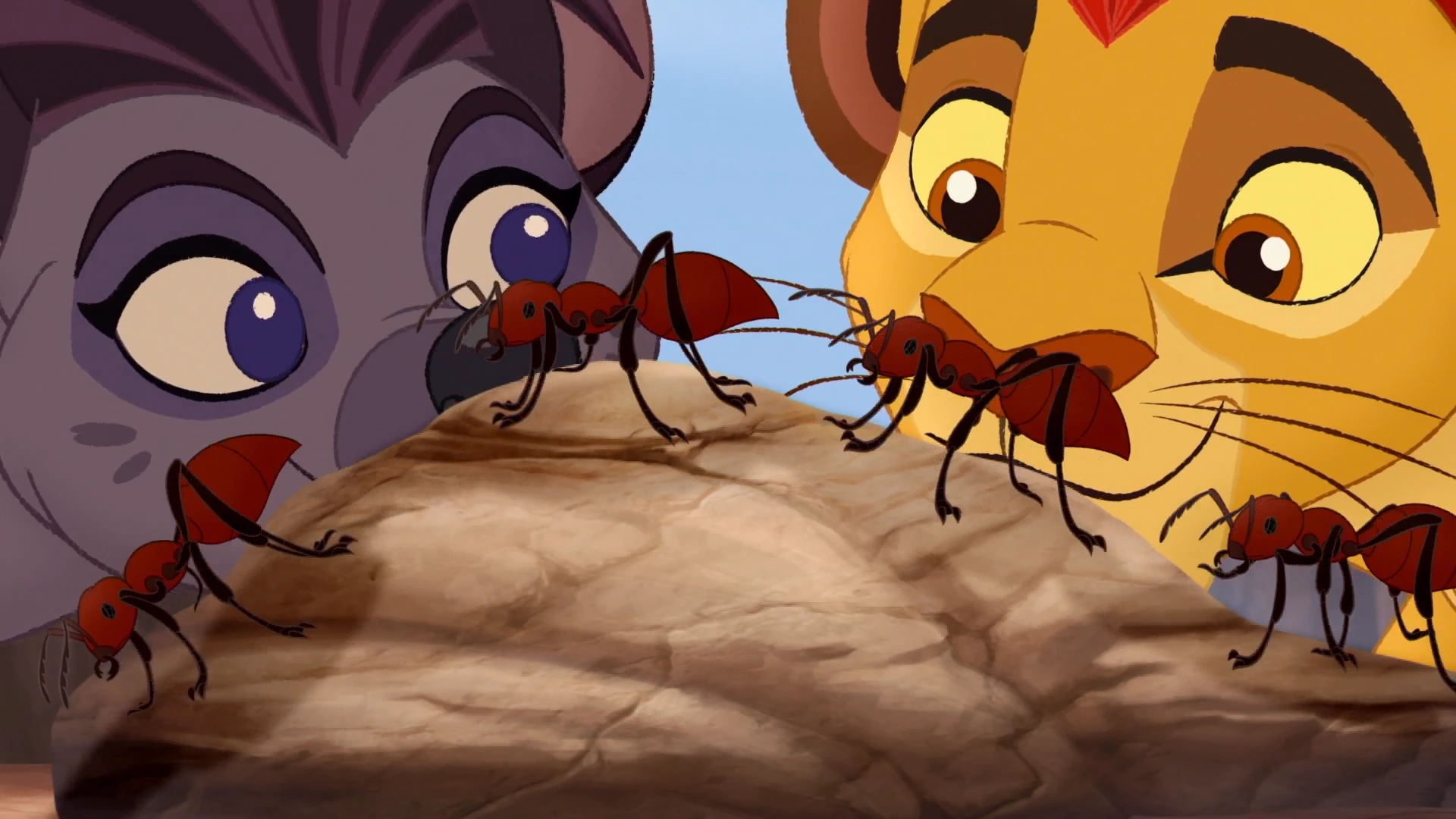 While Reirei's pack attacked some pangolins on the other side of the Pride Lands, Janja and his clan attacked Twiga and her daughter, Juhudi. Forced to split up his team, Kion sent Bunga, Fuli, and Ono to deal with the jackals while he and Beshte took on the hyenas. However, the two quickly got overwhelmed by the sheer number of hyenas, and Janja was only defeated when Twiga kicked him away from her and Juhudi. To Beshte's and Kion's surprise, Janja called the retreat, and he and his clan fled to the Outlands. As the Guard watched the jackals likewise flee into the Outlands, Ono spotted the two groups converging, and Kion deduced that they were working together.