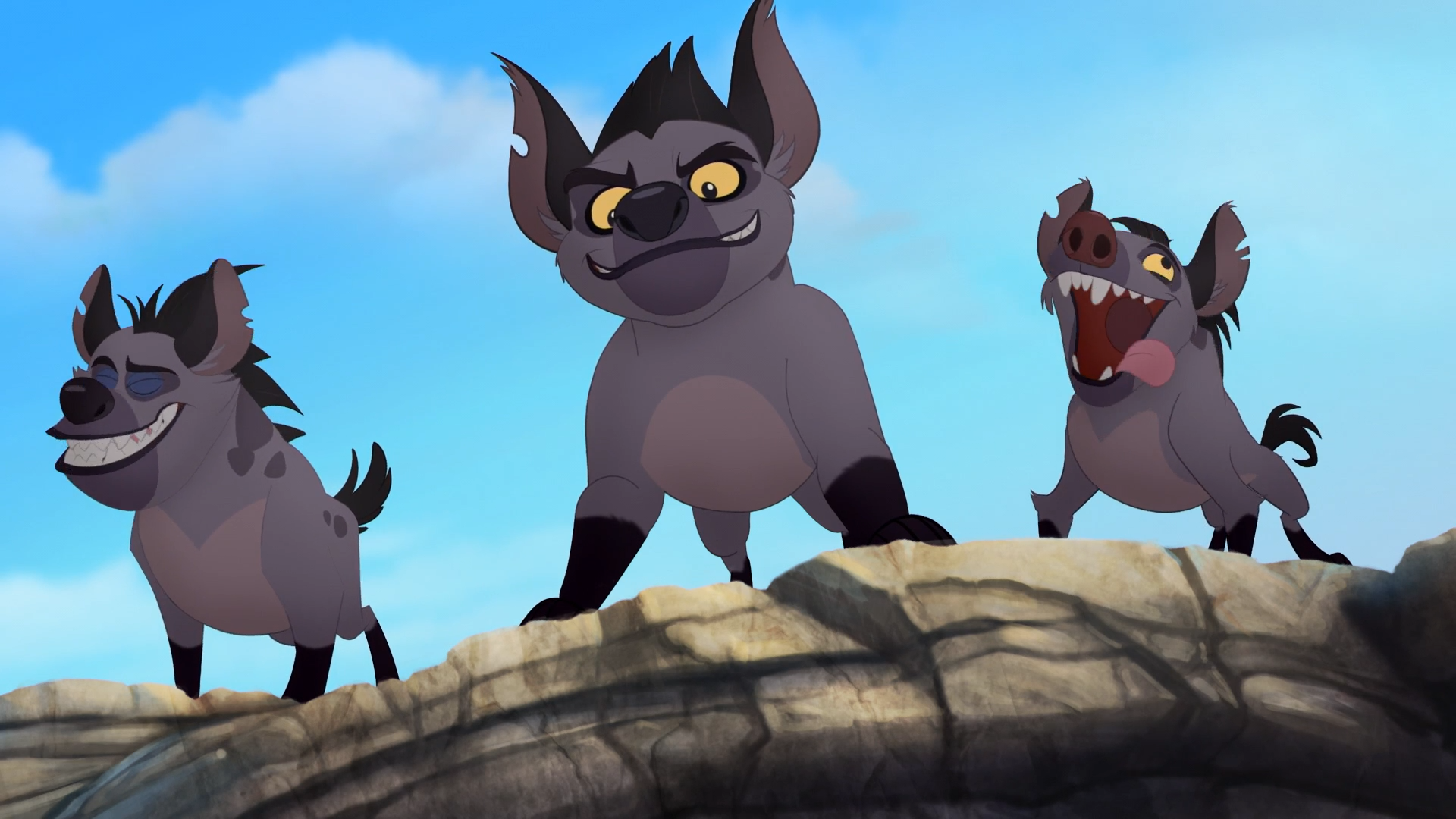 Shenzi, Banzai, and Ed confront Simba, Nala, and Zazu for trespassing.