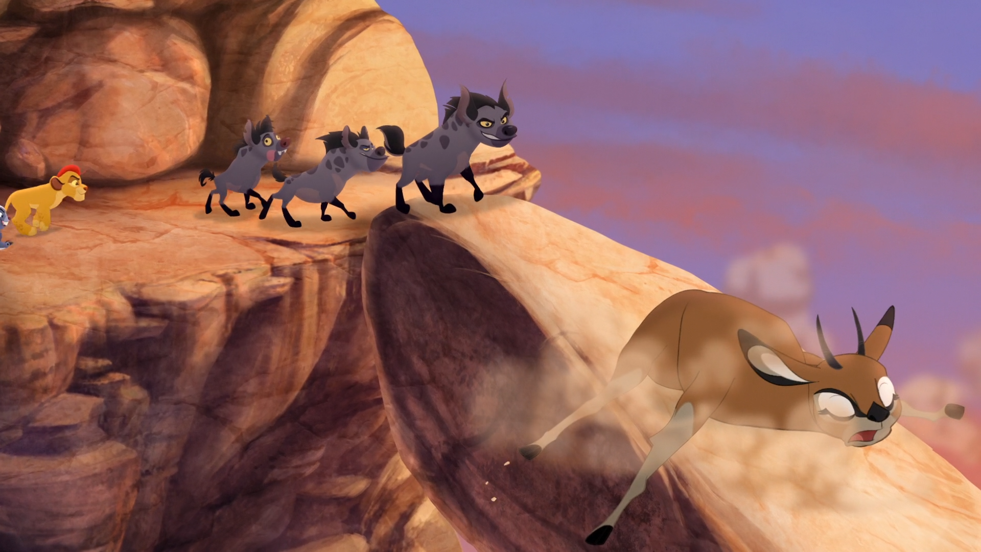 At that moment, Janja launched his plan alongside Nne and Tano, luring the Lion Guard away with a stampede of antelope. Once the Guard had calmed the herd, Kion voiced his suspicion that Janja was to blame, for he had caught a whiff of hyena scent. Across the Pride Lands, Nne and Tano betrayed Janja by forcing him over a cliff and trapping him on a high ledge. They then continued to chase a herd of oryxes through the Pride Lands.
