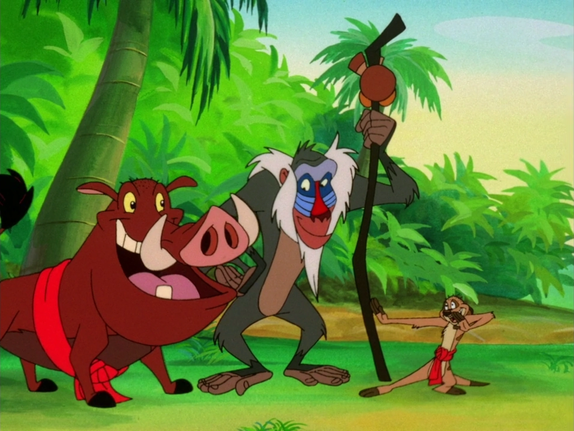 While Pimon and Tumbaa laugh at Timon and Pumbaa, Rafiki appears and tells the two friends to use Hakuna Matata to fight. Listening to Rafiki's advice, Timon and Pumbaa use their own weapons to fight the bullies. After the two friends defeat the bullies, Timon has an idea on what he and Pumbaa can do with them.