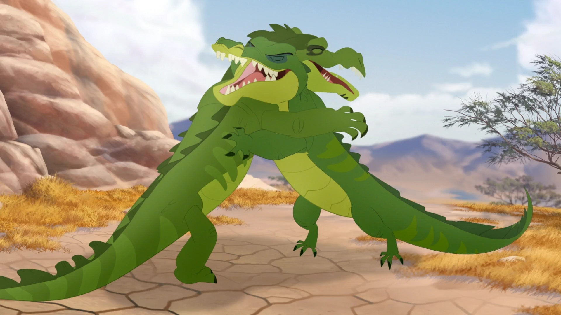 The Lion Guard saw Makuu training his float to fight and accidentally mistook it for a real fight. They started to break up the sparring but were warned to stop by Hodari, a gecko who was spectating from a tree. The Lion Guard quickly apologized to Makuu, who led his float in continuing their training. As they did so, Hodari mimicked their movements and professed to Beshte that it was his dream to be a crocodile, or at least an honorary one.