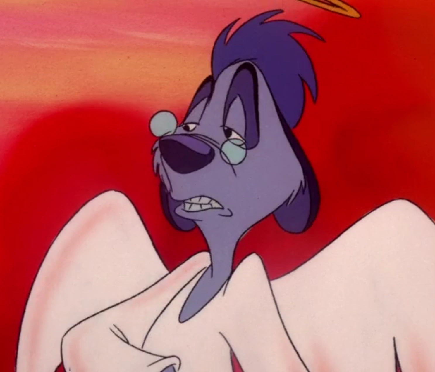 The meerkat angel is exceptionally tall and large, especially compared to Timon. He has purple fur, with dark fingers, ears, and toes. His eyes are black.[1]