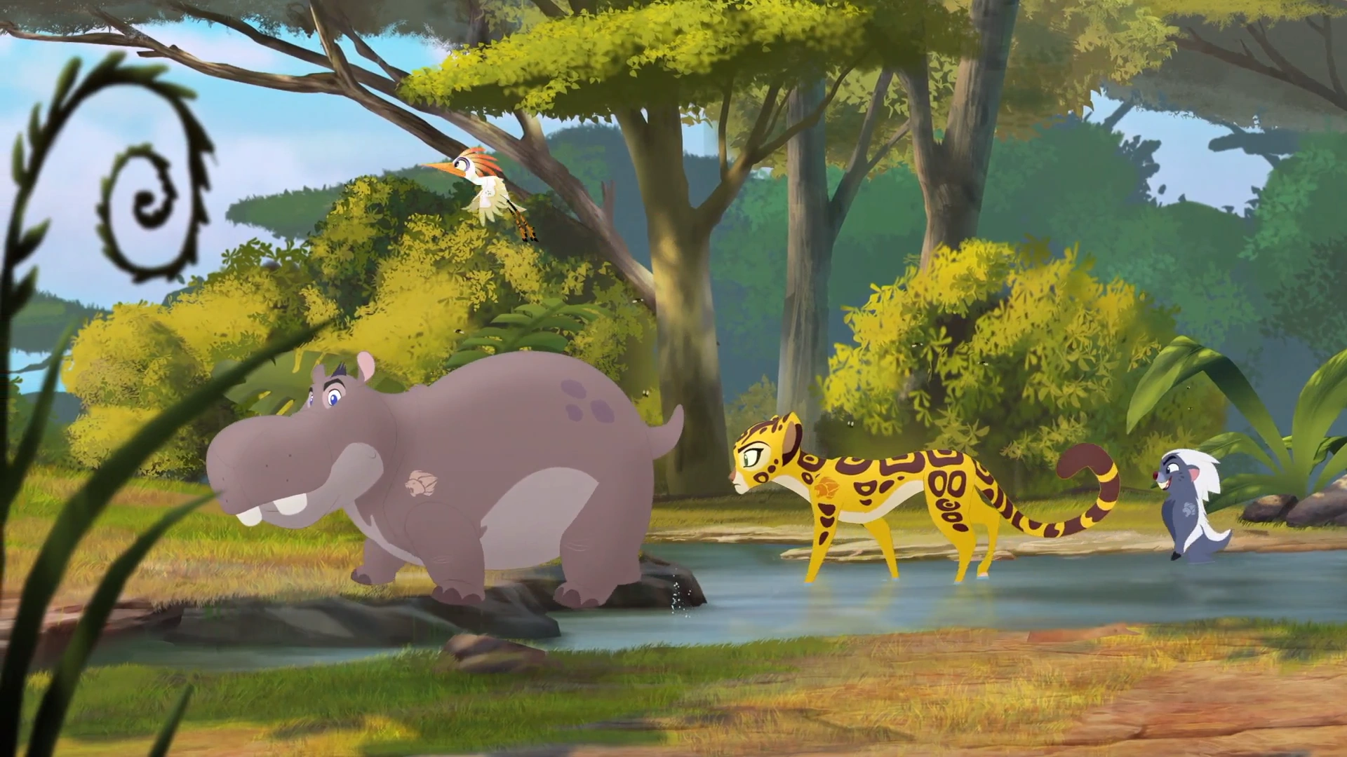 The Lion Guard wades through a stream as they search for Flat Ridge Rock.