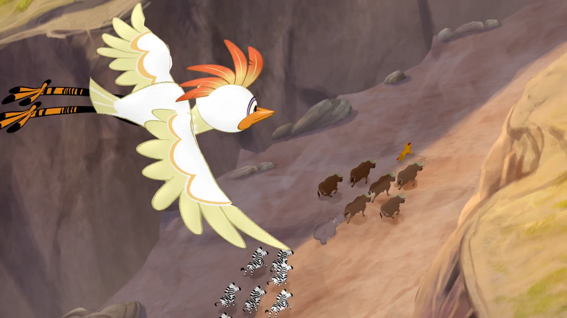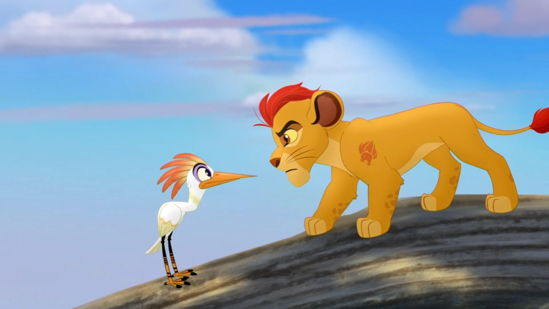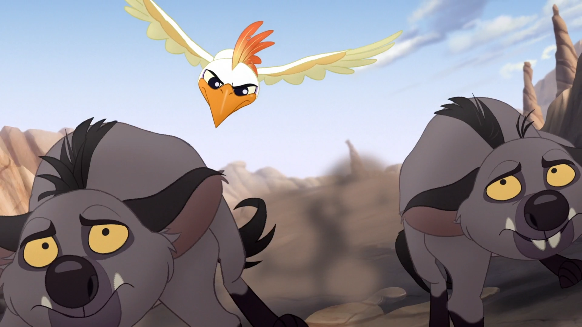 Shortly afterwards, the Lion Guard reached a canyon, where they spotted several goslings jumping off a cliff. To Kion's annoyance, Beshte insisted on saving them. Just then, the mother goose approached angrily, and Ono realized that the goslings had not been falling but were rather learning how to fly. As the Guard moved on, they ran into some peacocks, whom Ono explained were in the midst of a display. To the team's shock, Kion angrily bulled his way through.
