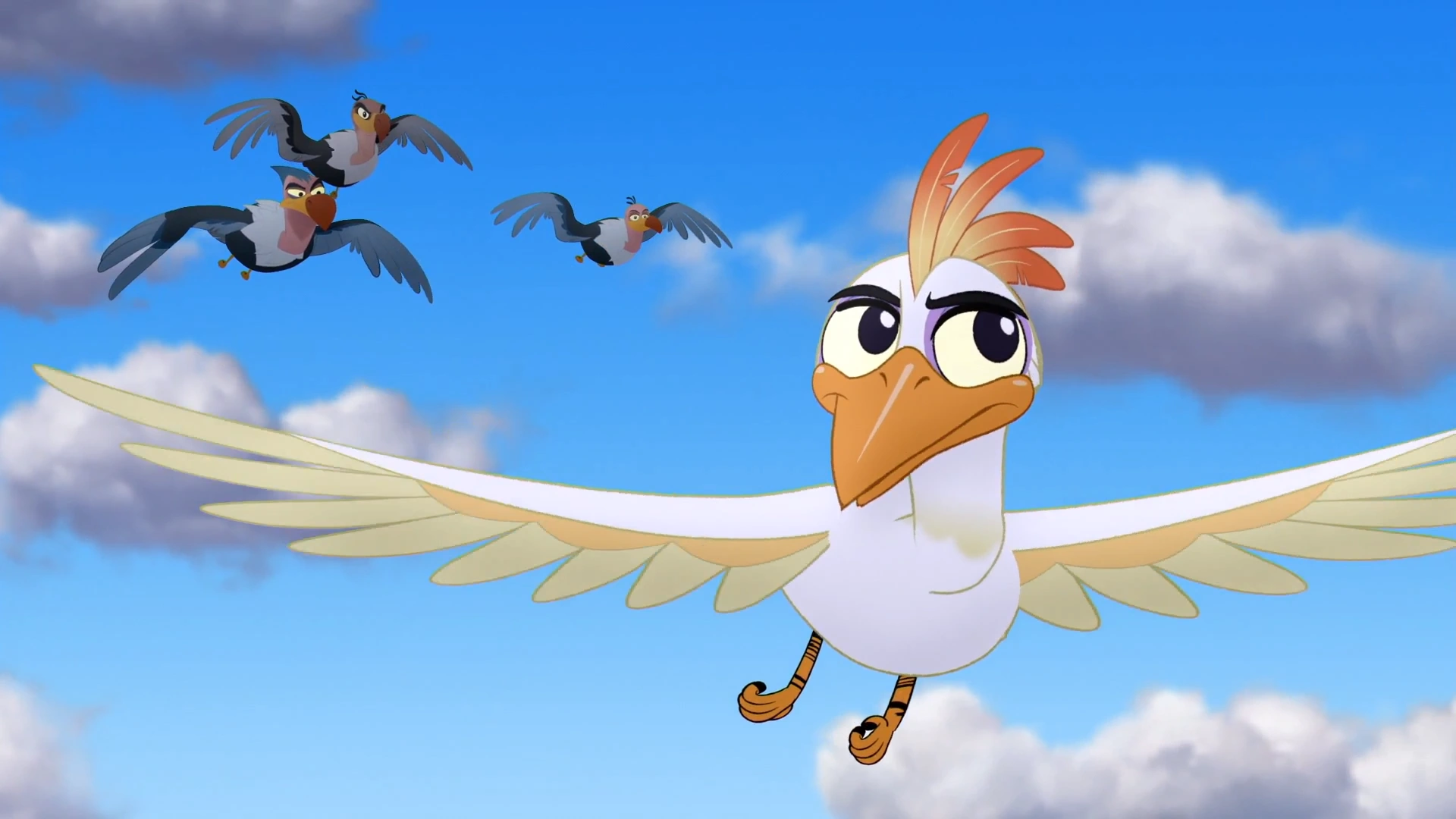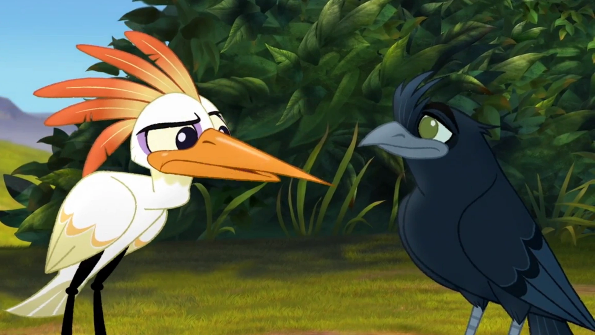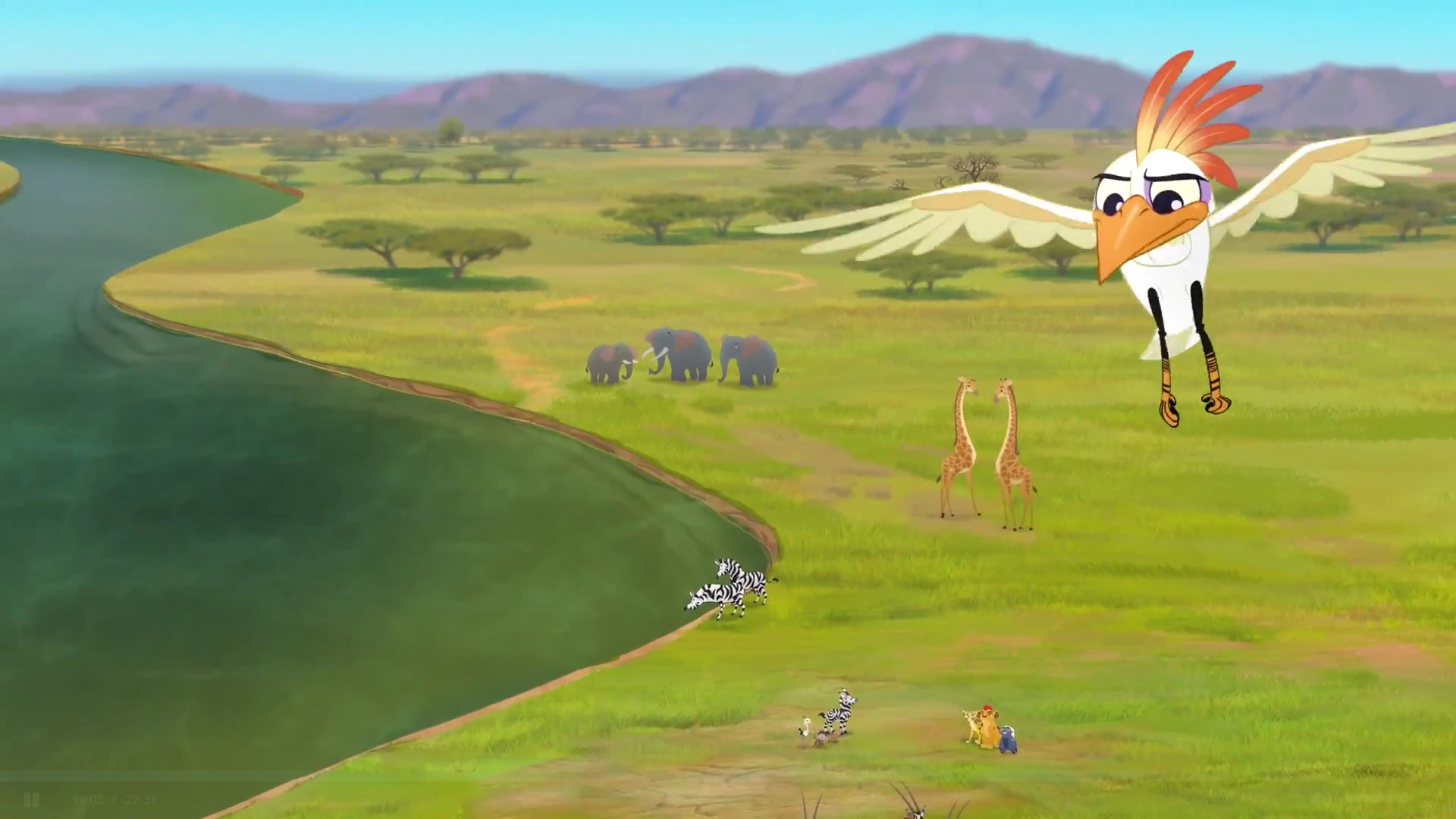 Shortly afterwards, the Lion Guard reached a canyon, where they spotted several goslings jumping off a cliff. To Kion's annoyance, Beshte insisted on saving them. Just then, the mother goose approached angrily, and Ono realized that the goslings had not been falling but were rather learning how to fly. As the Guard moved on, they ran into some peacocks, whom Ono explained were in the midst of a display. To the team's shock, Kion angrily bulled his way through.