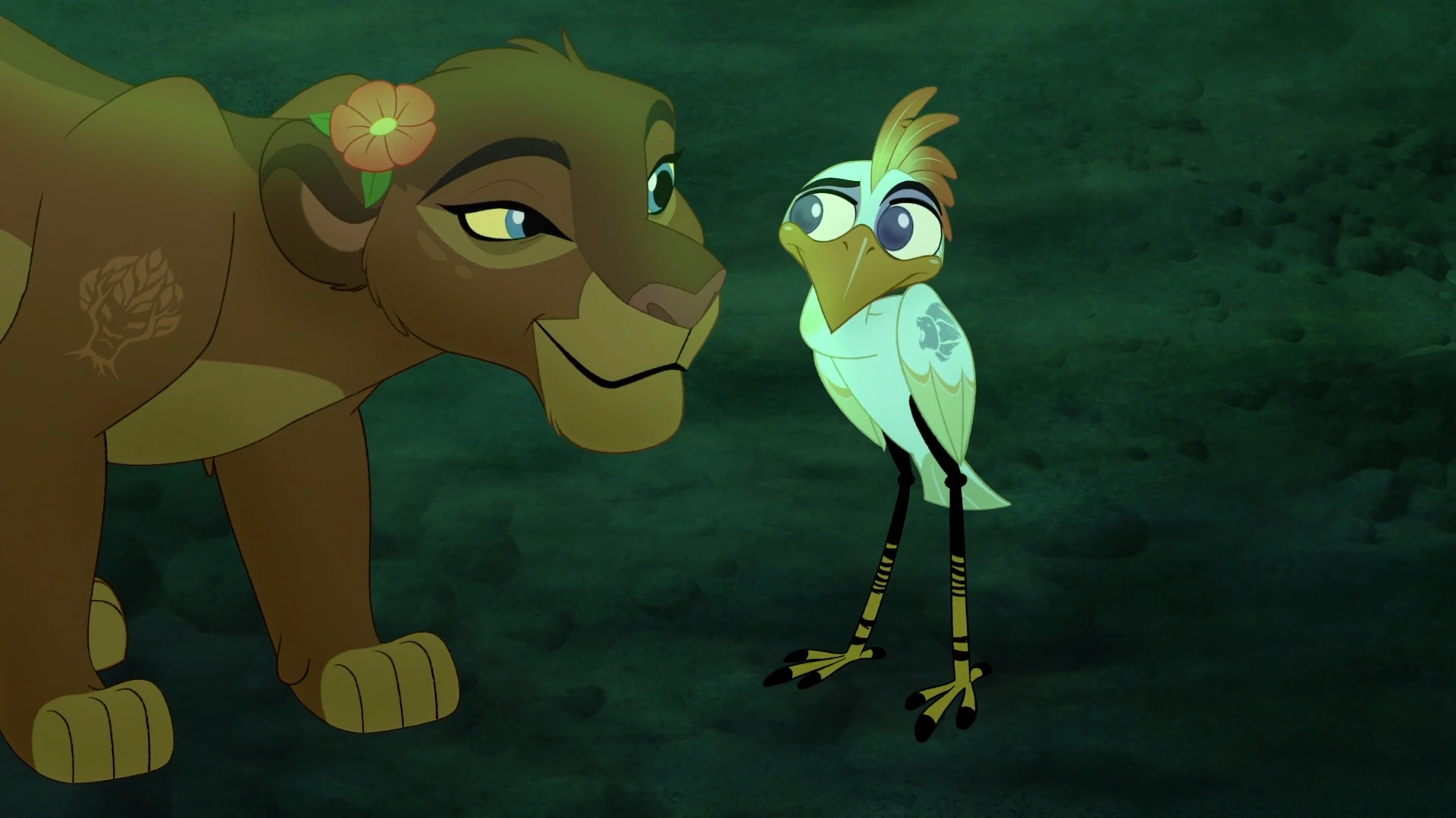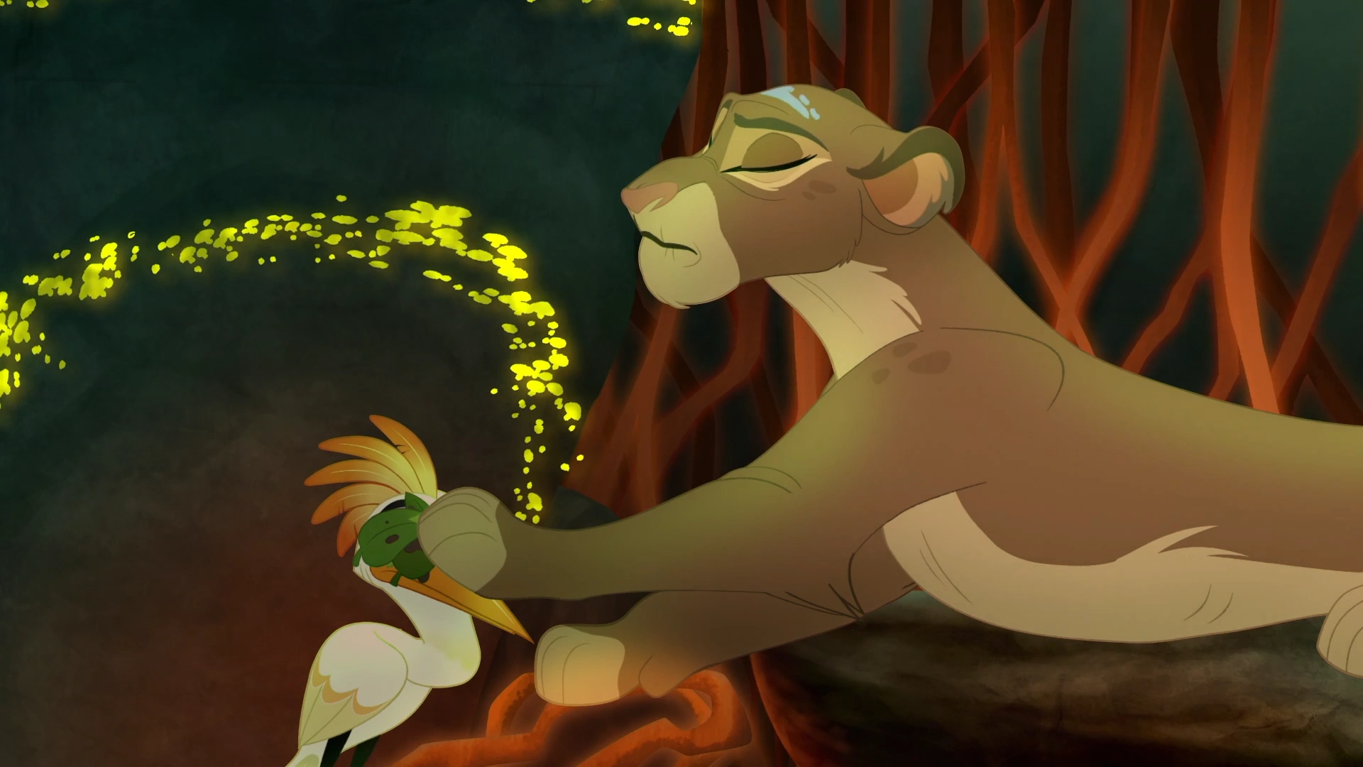 The Night Pride led the Lion Guard into the Tree of Life, where they met Queen Janna, and Kion explained that he and Ono had come for healing. Nirmala, a gifted healer, examined the pair's injuries and came to the conclusion that Kion's scar would be far more difficult to heal than Ono's eyesight. Hearing this, Janna ordered Rani to give the Lion Guard a tour of the kingdom while Kion began his healing journey with Nirmala.