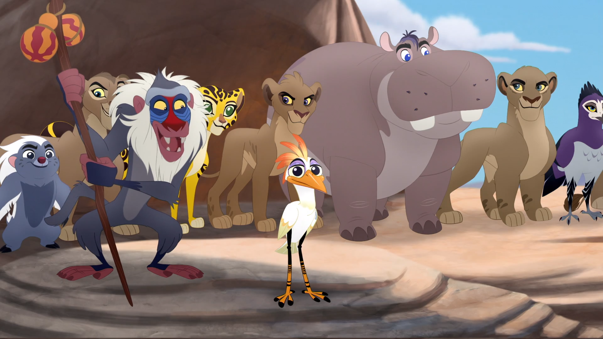 The Lion Guard entered the Outlands, where they ran into Madoa, who had been in hiding with the rest of Jasiri's clan. She explained that Zira's invasion of the Pride Lands had already begun, and Jasiri offered her clan's assistance to the Lion Guard. Just then, Mzingo flew up and agreed to help the Guard, per Jasiri's request.