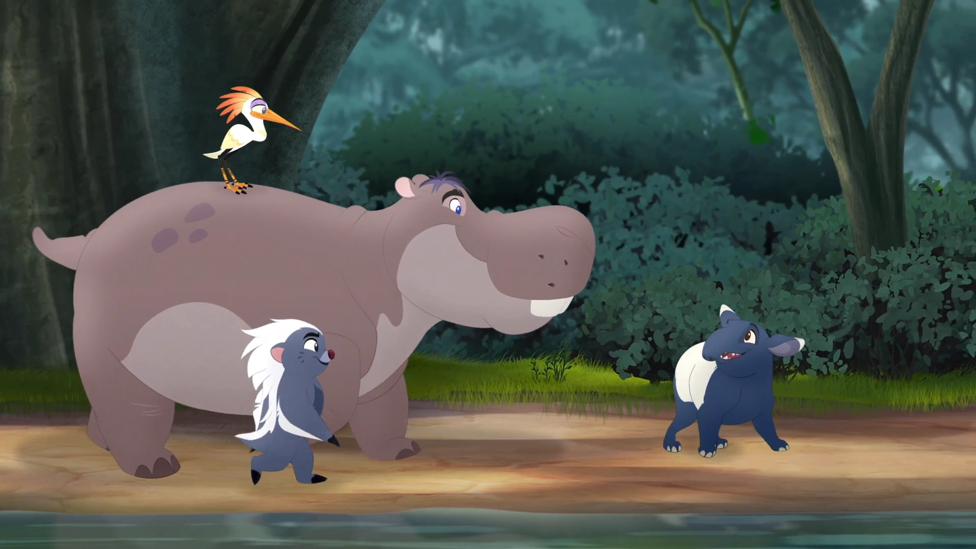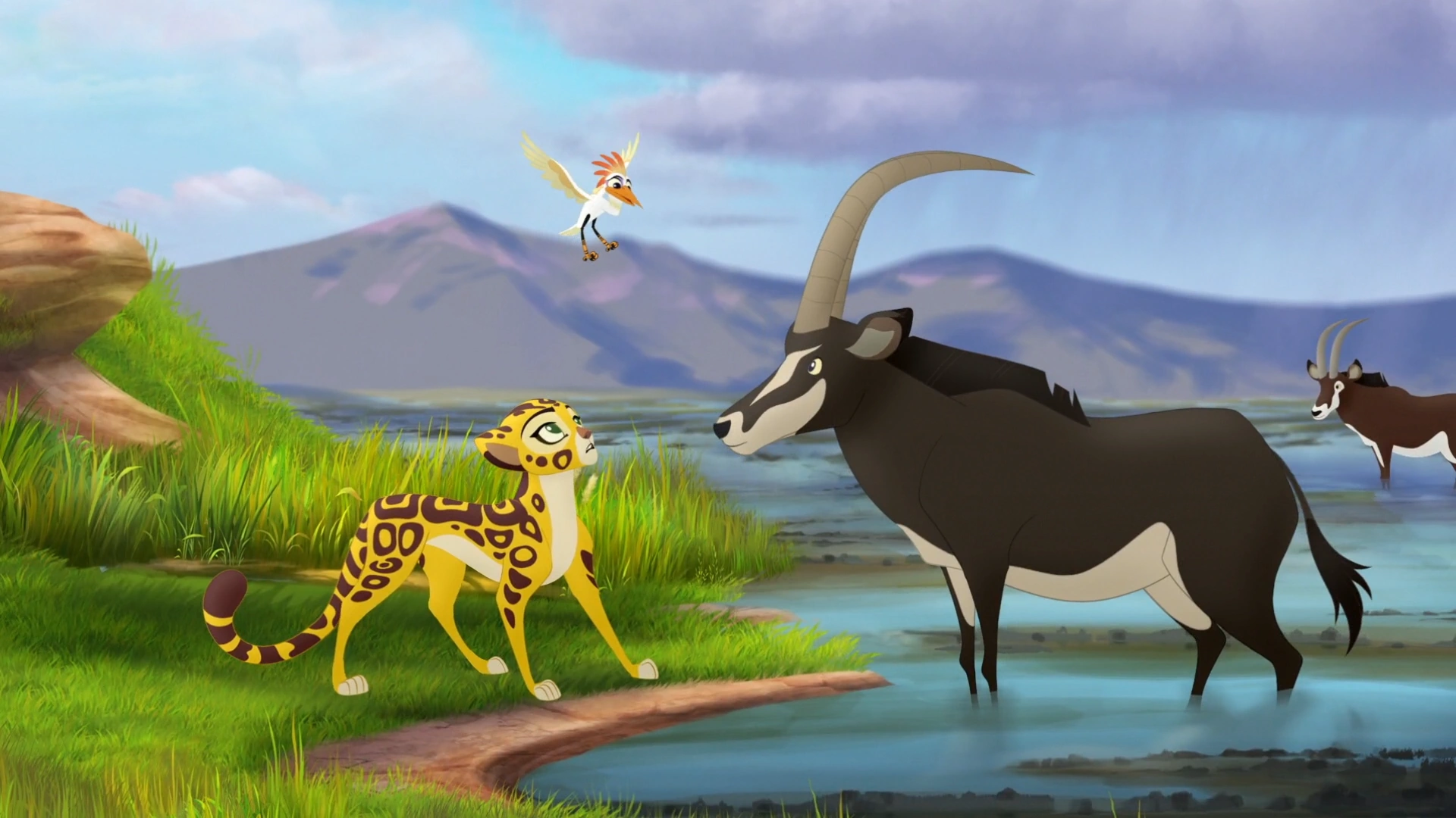 As the Lion Guard's journey began, Bunga led his friends into an area of dense jungle. After a few mishaps, including a run-in with Ushari, the team realized that Bunga was lost. Beshte suggested that they speak with a rhinoceros named Mbeya, who might be familiar with Flat Ridge Rock. Together, the Guard traveled to the watering hole, where Beshte spent a long time speaking with Mbeya. Eventually, the others grew impatient and insisted that Beshte wrap up his conversation. Realizing that he had forgotten to ask about Flat Ridge Rock, he rushed back to ask Mbeya for directions.
