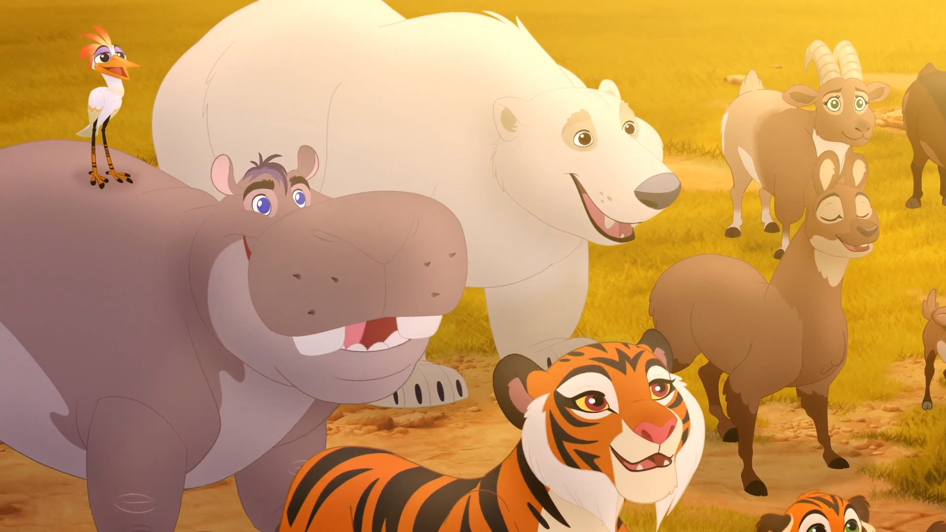 Later that day, at the meeting, Kion and Rani explained to the locals that Beshte was friendly, not destructive. Just then, Beshte approached with Pinguino on his back, and Pinguino declared that Beshte had saved his life, which effectively cleared the hippo's name. The locals then started up a chant of "Poa!" for Beshte.[71]
