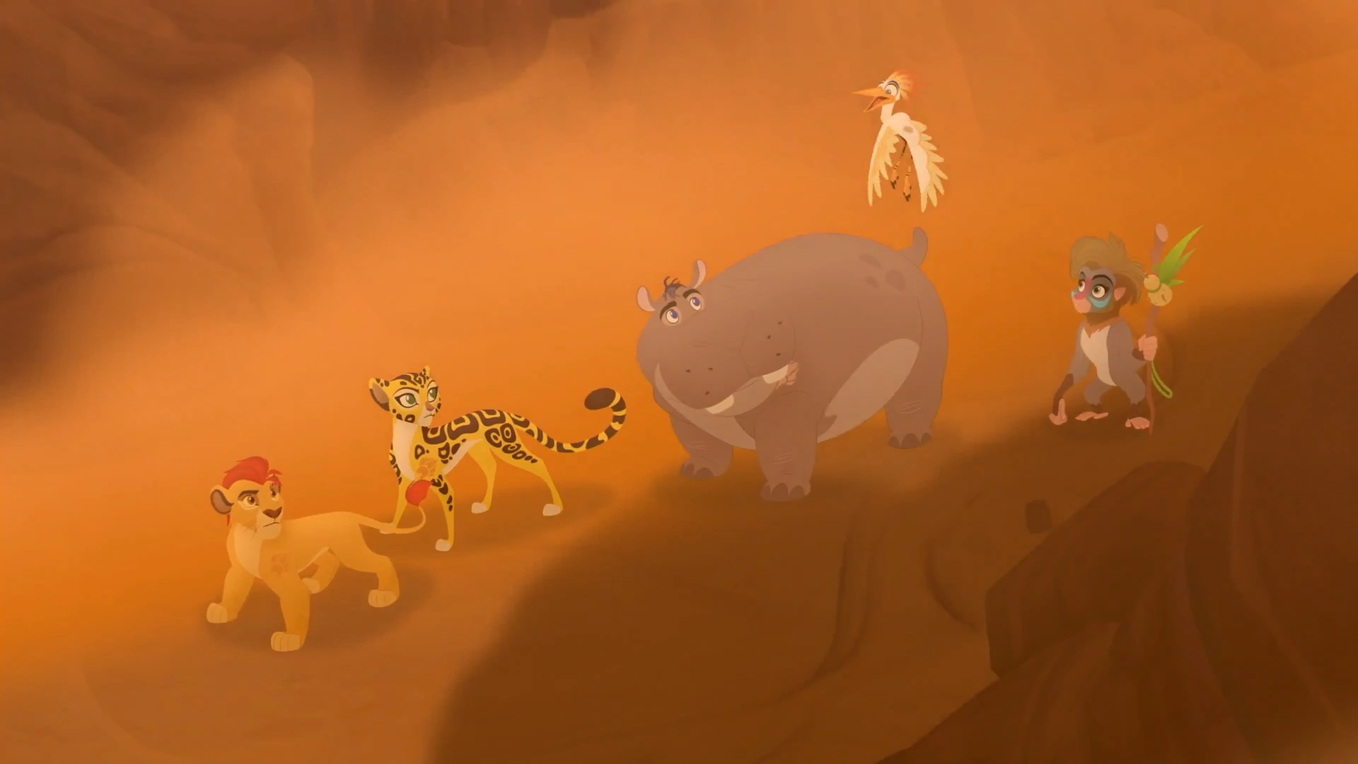 After Kion left, Fuli chastised Bunga for thinking that he was turning evil, and the rest of the Lion Guard voiced their determination to stand by their friend. Despite this, Ono worried that they would not reach the Tree of Life, but Fuli assured him that they would leave as soon as Kion returned. However, as time passed, the group decided to look for Kion. In searching for him, Anga found him dangling from a cliff, and the rest of the Guard gathered around him, at a loss as to what they could do.