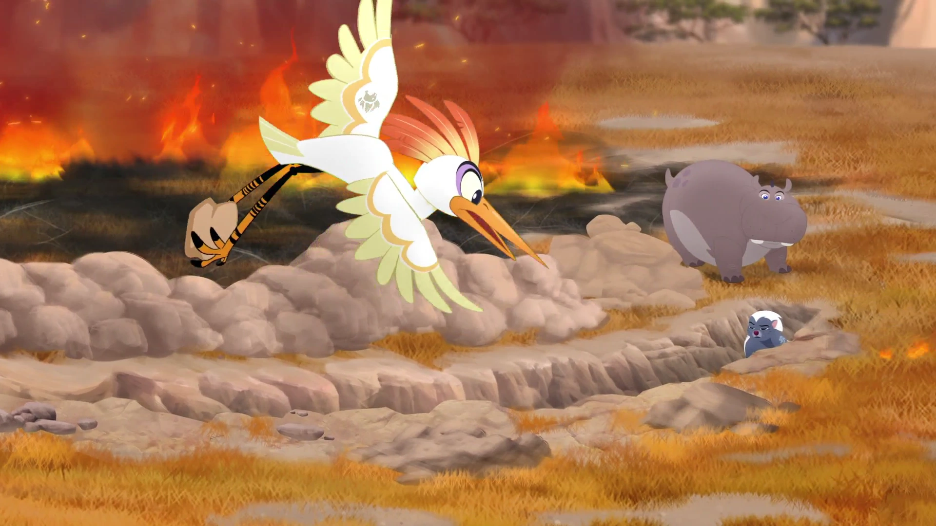 Once the hyenas had been dealt with, Ono spotted an injured Kiara trapped amidst the stampeding gazelles. Per Kion's instructions, he led Bunga and Fuli to where she was trapped behind a rock, and Bunga scattered the stampede using his stink. Afterwards, Kion defeated Janja's clan with the Roar of the Elders. Watching the Lion Guard's victory from afar, Simba accepted them as the new protectors of the Pride Lands.[2]
