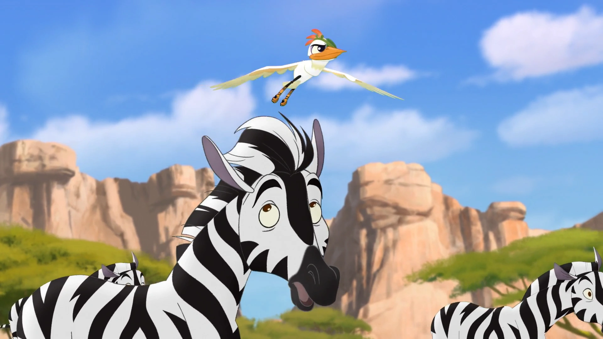 In the Outlands, Mwoga informed his parliament about Ono's eye injury, and they debated how to proceed. Janja happened to overhear the vultures and hatched a plan to trick the Lion Guard while Ono was out of commission. Meanwhile, Rafiki attempted to paint a picture of the Lion Guard but was continually unsatisfied with his work. At that moment, Beshte rushed up to his friends and reported that Janja had been spotted in the Pride Lands, overlooking a herd of zebras from a high cliff. Horrified, Kion led his teammates to investigate, save Ono, who stayed behind with Rafiki.