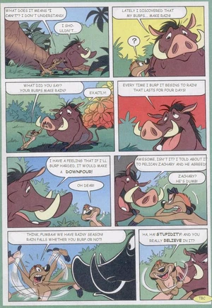 Pumbaa admits to Timon that his burps cause rain. He surmises that his larger burps could cause a downpour and reflects on how he had told his story to his friend, Zachary the pelican. Timon dismisses the story as folly and laughs at Pumbaa for being so easily fooled.