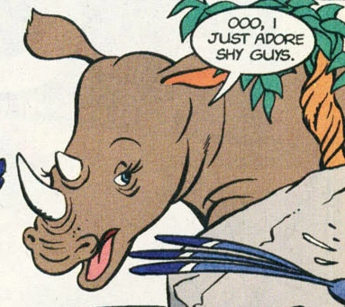In the midst of the chase, Zazu ran into a nervous young rhinoceros named Kuloo and arranged for him to hide behind a tree. When Rasha drew near, Zazu called for her, and she ran her horn through the tree, which caused her to collide with Kuloo. Upon seeing each other, the rhinoceroses immediately fell in love.[1]