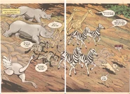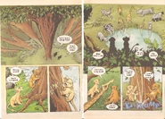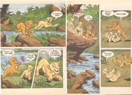 At that moment, a giraffe ordered the cubs to stop stepping on its lunch, and so, they fled again. However, they ended up getting chased by various Pride Landers who were tired of their antics. At one point, they accidentally stepped on a snake's back and raced away in fear. At last, they returned to their original play place, where Sarabi told them that they would not get into trouble there. This relieved both cubs.