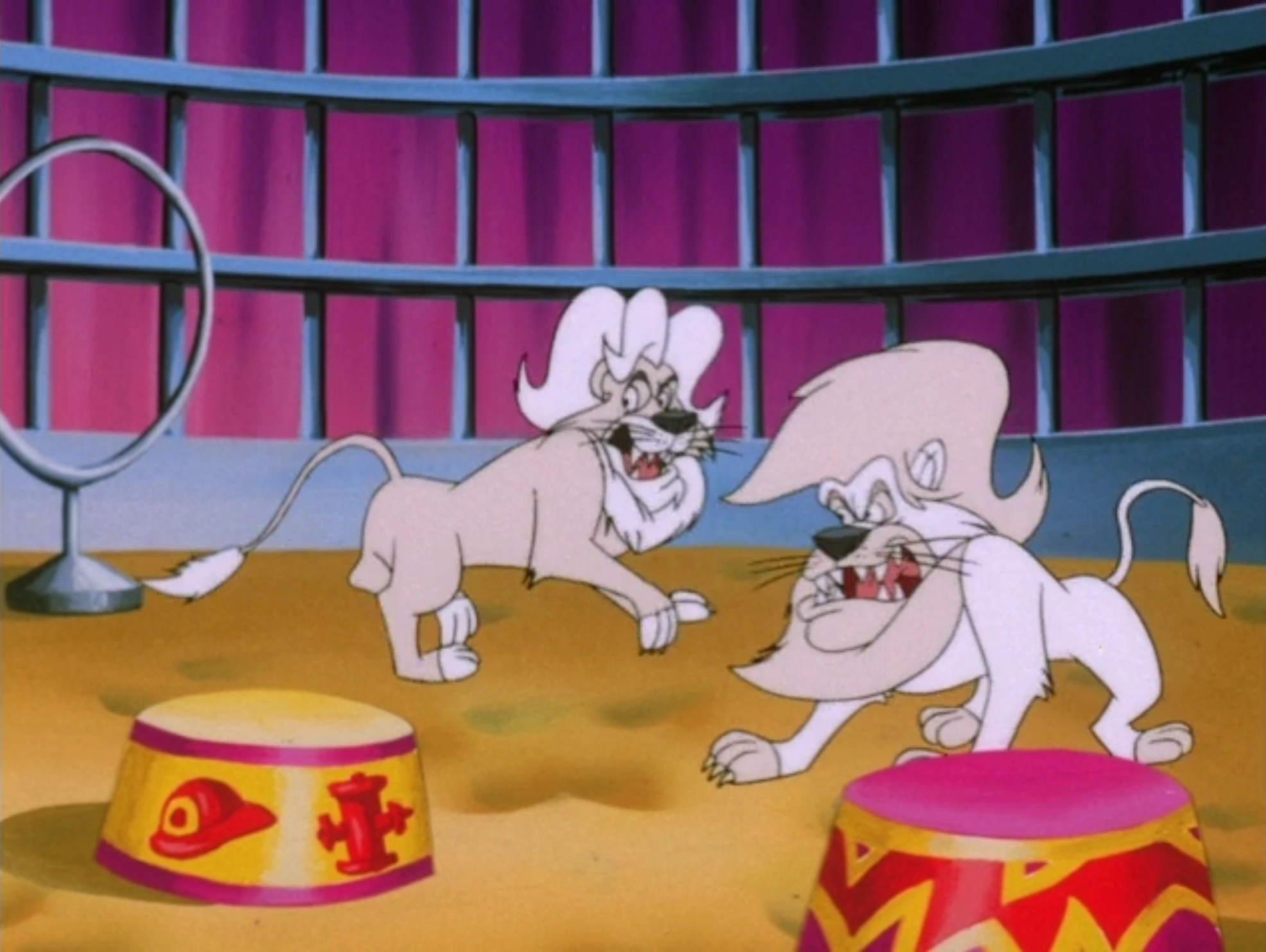 As the show began, Timon and Pumbaa entered the lion cage to direct Heimlich and Schnitzel. The lions began to show their frightening sides, which terrified Pumbaa. Timon tried to calm his friend down by telling him that anything carnivorous the lions did would just be an act. Timon then tried to fight the lions, but they defeated him.