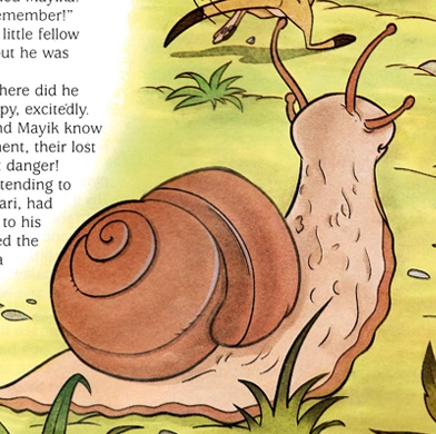 When Timon was searching the foliage for grubs, out slithered the largest snail he had ever seen. Terrified, the meerkat fled for his life, but he pulled to a halt when the snail assured him that he was friendly. Slippy went on to observe Timon's companions and noted that Mayik and Mayika bore a strong resemblance to a monkey he had seen only a few days ago. Eager to hear news of their son, the monkeys pressed Slippy for information, and he informed them that the little monkey had last been seen walking off with a snake.[1]