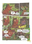 Pumbaa decides to outwit the hyenas, despite Timon's doubts. He questions the hyenas as to how they plan to eat such a small morsel between the three of them. This prompts a fight between the trio, until Banzai declares that a warthog is a much better-sized meal. Thinking fast, Pumbaa steps on the edge of a log, bringing up the other end to strike and knock out the hyenas.