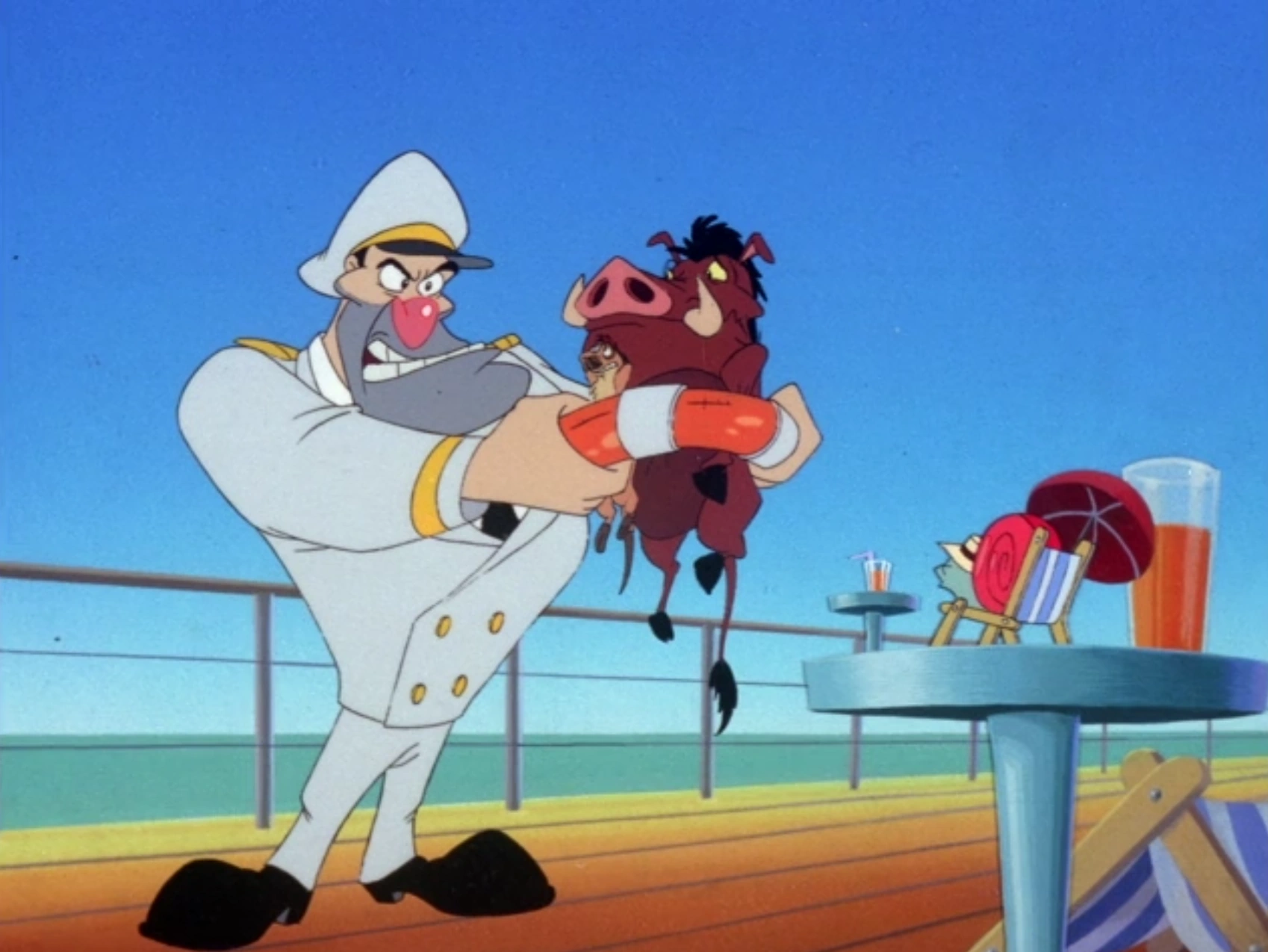 For their second attempt to rescue Speedy, Timon and Pumbaa disguised themselves as pirates who wanted Speedy, but the jeweler's wife wanted to be their pirate queen. Pumbaa confessed the truth to her, and consequently, he and Timon got kicked out of the cabin. For their third attempt, Timon and Pumbaa approached from underwater. Timon spotted the room where Speedy and the couple were and drilled a hole into the bottom of the boat. Though Pumbaa tried to stop him, Timon ignored him, and his actions caused the boat to fall and land on the two.