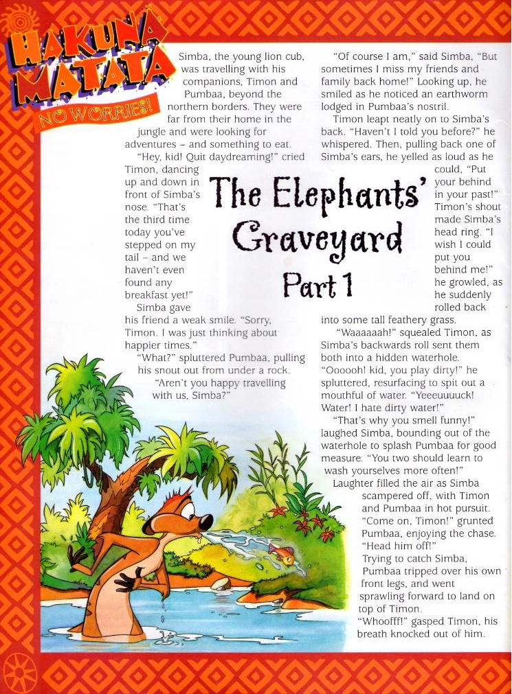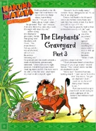 The Elephants' Graveyard is a magazine story inspired by The Lion King. It was published in three issues of The Lion King: A Nature Fun and Learn Series as part of the Hakuna Matata magazine series.