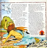 Meanwhile, Lion struggles to fly while hunting. He soon realizes that something must have gone wrong back home and hurries back to his pile of bones. Upon seeing all the bones lying in a broken heap, he attempts to kill the birds for failing to protect them, but they simply fly away. He then turns his wrath on Frog, but the nimble amphibian escapes him every time. Finally, Lion is forced to admit defeat and begins to hone his skills as a land hunter.