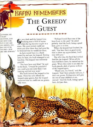 The Greedy Guest is a story from the Rafiki Remembers magazine collection. It was published in the 1990s as part of The Lion King: A Nature Fun and Learn Series.