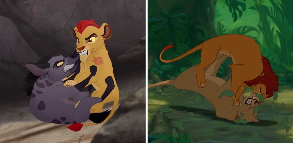 As the chaos continues down below, Kion and Simba implore the Pridelanders to work together in fighting off the jackals, and Kion jumps down to join the Lion Guard in wrangling up the jackal family. Together, they corner Reirei and her family in the midst of the tree grove, and Kion orders them to return to the Outlands. Still dripping with dramatic flair, Reirei pleads for a second chance until Simba steps forward and roars, frightening the jackals into running away.