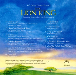 The Lion King (Original Motion Picture Soundtrack) is the original motion picture soundtrack for Walt Disney Picture's The Lion King. It contains songs from the film written by Elton John and Tim Rice, and a score composed by Hans Zimmer, with African chants by Lebo M. The soundtrack was recorded in three different countries: the United States, the United Kingdom, and South Africa, and was released on May 31, 1994, on CD and audio cassette. It holds the record as the best-selling successful soundtrack for an animated movie with over 7 million copies sold; 4,934,000 copies of which were sold in 1994.[1] Also, it held the record for the longest charting animated movie soundtrack at #1 on the Billboard 200 chart for 10 weeks,[2] until it was surpassed by Frozen, which continues to hold the record for 13 weeks.[3]