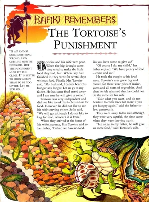 The Tortoise's Punishment is a story from the Rafiki Remembers magazine collection. It was published in the 1990s as part of The Lion King: A Nature Fun and Learn Series.