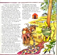 However, despite their careful rationing, they eventually run out of food again, and Tortoise's wife begs her husband to visit her father again. This time, Tortoise refuses, unwilling to beg for help, and instead sneaks over in the night to steal his father-in-law's food. On his way out of the house, he accidentally drops the food and makes a frightful clamor, which draws the attention of his father-in-law. Furious, his father-in-law ties him to a tree and publicly shames him until the other animals convince him to bring Tortoise down. Both tortoises learn their lesson that day.