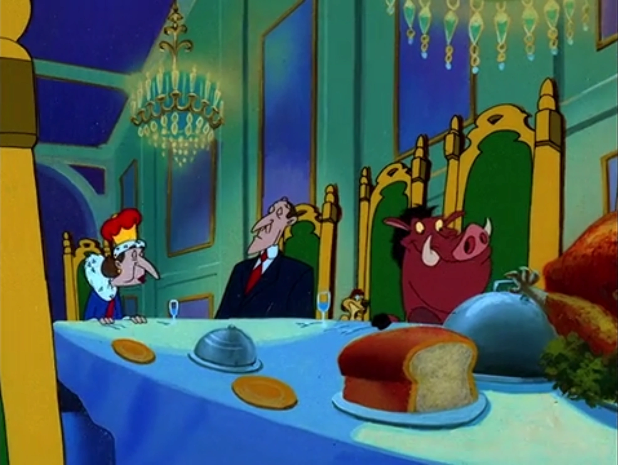 Timon, Pumbaa, the assistant, and the Empress are now having a fancy dinner. A winged bug gets into Pumbaa's soup and the warthog goes after it, accidentally and recklessly ruining the dinner. After the assistant calls Pumbaa a peasant, Timon tells him and the Empress the truth, thus Timon and Pumbaa get banned from the building. Timon apologizes to Pumbaa for ruining their vacation by pretending to be something he's not, but Pumbaa tells him that no matter what he pretends to be, he is really his Bestest Best Friend. The duo then chases the winged bug Pumbaa was after during the dinner.
