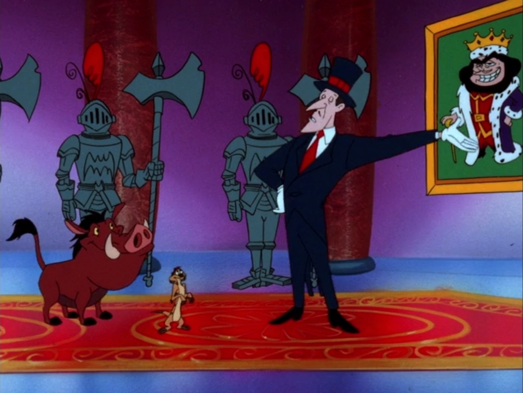 The assistant takes Timon and Pumbaa to the Imperial Museum of Etiquettica. He guides them to see a picture of their first emperor, Jean-Claude Fluggin. When he wipes the picture, Pumbaa smells the dust and uses the priceless copy of Etiquettica's constitution as a tissue to sneeze on. The warthog wipes the constitution on an armor, causing it to make the other armors fall and ruin the picture.