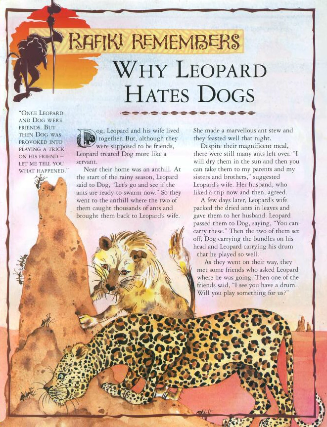 Why Leopard Hates Dogs is a story from the Rafiki Remembers magazine collection. It was published in the 1990s as part of The Lion King: A Nature Fun and Learn Series.