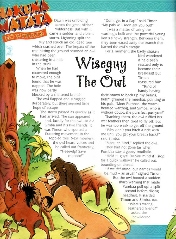 Wiseguy the Owl is a magazine story inspired by The Lion King. It was published in one issue of The Lion King: A Nature Fun and Learn Series as part of the Hakuna Matata magazine series.