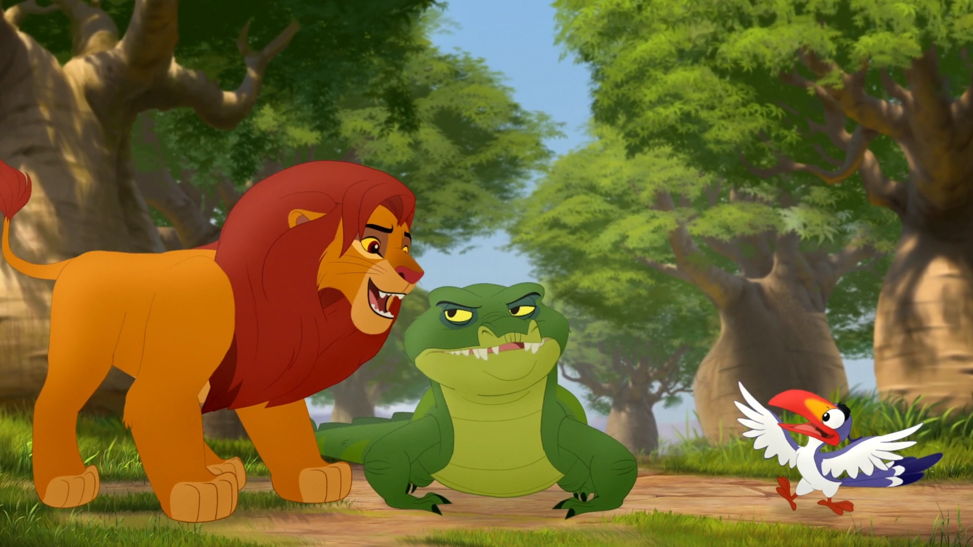 Zazu reports to Simba and Kion that Hadithi and Shujaa have arrived.